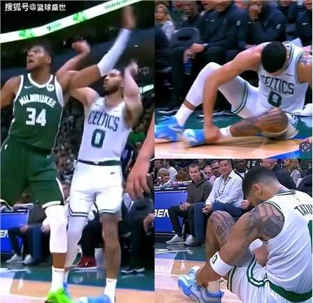 比赛的争议发生在第三节。当时塔图姆在底角位置完成了一次三分出手,但就在他跳投落地时,脚却踩在了字母哥的脚上,导致他的脚踝瞬间呈现出惊人的90°扭曲。塔图姆倒地后痛苦地抱着脚踝,无法立即起身回防,凯尔特人第一时间请求暂停,球队医务组立即上前查看伤情。