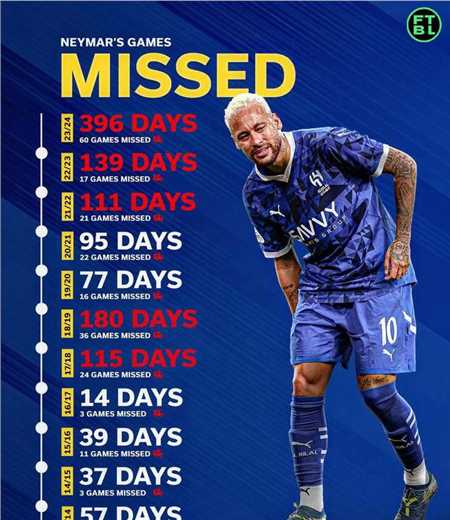 尽管内马尔的职业生涯充满了辉煌,但频繁的伤病对他的表现造成了不小的影响。数据显示,从2013/14赛季到2023/24赛季,他因伤缺席的比赛累计天数和场次显著。然而,内马尔在面对伤病和其他困难时,依然能够保持高水平的竞技状态,体现了他在逆境中的韧性和坚持不懈的奋斗精神。