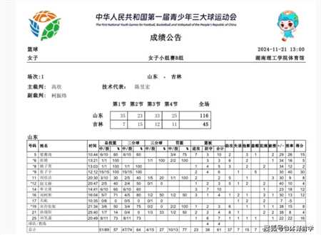 11月21日,第一届全国青少年三大球运动会,女篮比赛迎来首轮比赛,张子宇代表的山东青年队,此番对阵吉林青年队,双方经过四节比拼,结果,山东青年队迎来了一场大胜,以116-45赢了吉林青年队足足71分。山东队拿下本场比赛,也是收获了本届赛事的开门红,而吉林青年队则遭到了开门黑。