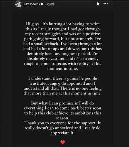 “我完全崩溃了,但保证会尽快复出。”曼联球星卢克·肖自宣再次受伤。