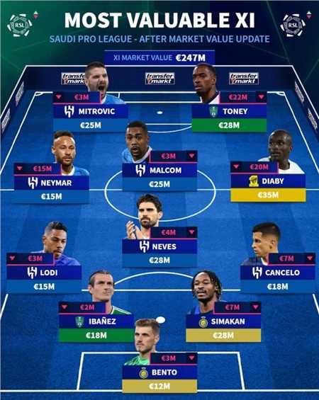 鲁本-内维斯(利雅得新月)2800万欧元、穆萨-迪亚比(吉达联合)3500万欧元、马尔科姆(利雅得新月)2500万欧元、内马尔(利雅得新月)1500万欧元