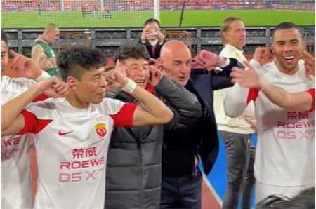 足协杯夺冠后,海港主帅穆斯卡特在和球迷在庆祝时做出了堵住耳朵的动作,并示意武磊和其他海港球员一起做出这个动作。