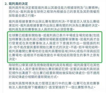关于半场结束后,裁判是否可以回看var并且判罚点球,规则其实早有解释: 在球赛已经重新开始后,或裁判员已表示半场或全场完结后(包括加时赛事)以及裁判员已离开球场范围或腰斩球赛之后,若裁判员才自行发觉或在其他赛事执法人员提示下意识到作出了一个错误的判决,他不能改变其重新开始比赛方式的决定。不过,如半场完结时,裁判员离开比赛场地前往裁判员覆检区域(rra)或指示球员返回比赛场地,这样就不妨碍改变在半场完结前刚发生的事件之原有决定。
