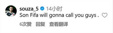 德索萨回复道:“son(德索萨可能想写soon) fifa will gonna call you guys .(很快国际足联就会联系你们。)”