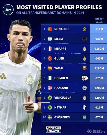 今天,德国转会市场列出了2024年度德转全平台球员资料页浏览量排行榜,其中c罗居首,梅西、姆巴佩位列前三。