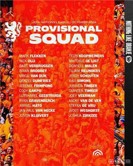 荷兰国家队官方公布了10月份欧国联初选大名单,范戴克领衔,德利赫特、齐尔克泽在列,阿克缺席。