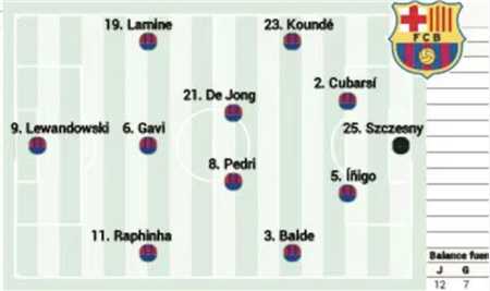 前锋:莱万多夫斯基、拉菲尼亚、亚马尔