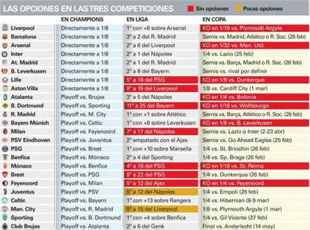 利物浦、阿森纳、拜仁、多特、米兰等豪门已无法实现这一目标(在足总杯、德国杯、意大利杯出局),曼城(落后榜首15分)与尤文(落后榜首12分)也无法实现,除非发生奇迹(注:世体此处将联赛落后10+积分默认为没有机会,勒沃库森落后拜仁8分在列)。