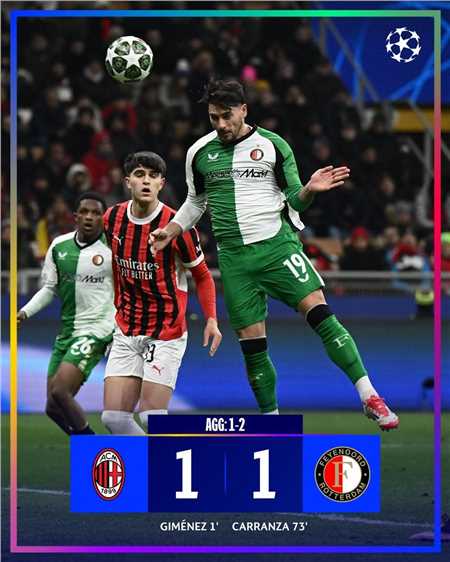 此役客场对阵米兰,开场第1分钟先丢一球的费耶诺德在多一人作战后凭借卡兰萨破门扳平比分,最终1-1战平对手,以总比分2-1淘汰米兰,晋级欧冠16强。