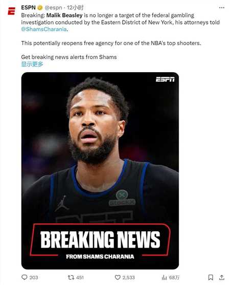 北京时间8月23日,nba名记shams报道,马利克-比斯利的律师透露,针对比斯利的调查已经结束,他没有受到赌球指控,这位顶级射手将进入自由市场。律师表示:“比斯利没被起诉,也不是此次调查的目标,本不该对他造成如此灾难性的后果。”