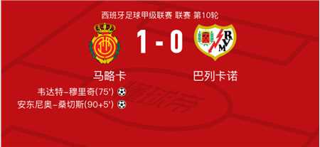 北京时间10月20日马略卡vs巴列卡诺,韦达特-穆里奇得到全场最高的7.7分,阿里达内-埃尔南德斯得到全场最低的6.2分